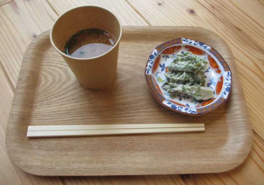 ゴールデンウイークいかがお過ごしでしょうか。今日限定商品のお知らせです!タラの芽のくるみ和えとノビルの味噌汁のセットを500円で販売中です。大鹿村の春の味を是非食べに来てください。